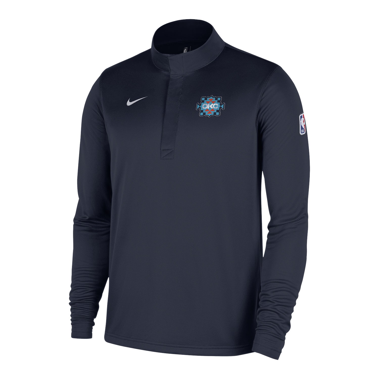 Wear the same gear as your hardwood heroes in this 2025-26 OKC Thunder City Edition Authentic 1/4-Zip Jacket from Nike. Featuring embroidered Thunder details and design elements inspired by Oklahoma’s Native heritage, this lightweight polyester jacket delivers authentic on-court style and performance.
